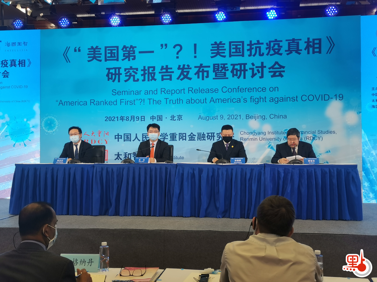 根據美國約翰霍普金斯大學的統計,截至本港時間今日(9日)下午6時,美國有超過3576萬人染疫,逾61.68萬人染疫不治,確診病例和死亡病例全球居首。在沉重的現實面前,近日美國媒體反而將美國抗疫評為「世界第一」。中國人民大學重陽金融研究院、太和智庫、海圖國智三家智庫今日在北京發布《「美國第一」?!美國抗疫真相》研究報告。報告指出,在抗疫中,美國「為黨爭不為生命」,防疫反科學、反常識,疫情加劇社會撕裂,並譴責美國在病毒溯源問題上對中國搞「有罪推定」,甩鍋他國,將疫情武器化。