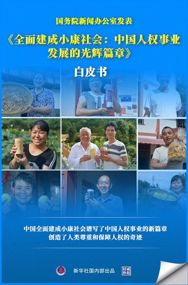 據新華社報道,國務院新聞辦公室今日(12日)發表《全面建成小康社會:中國人權事業發展的光輝篇章》白皮書。