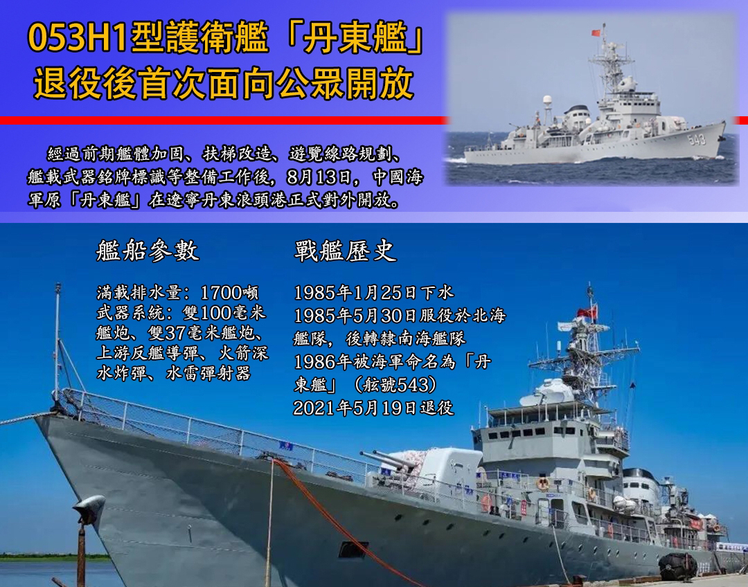 目前停泊於遼寧丹東的053H1型導彈護衛艦丹東艦8月13日正式對外開放,遊客必須持有中國國籍才能入場參觀。據了解,丹東艦服役36年來,出色完成了戰備巡邏、海上維權、出國訪問等一系列重大任務,被上級機關授予「不怕苦、不怕累,特別能戰鬥」稱號,譽為「丹東艦精神」。作為20世紀80年代我國自主設計建造的導彈護衛艦,丹東艦艦長103.2米,寬10.8米,高28.06米,平均吃水3.4米,最大航速21節,續航力4000海里,滿載排水量1944噸。雖然已經開放參觀,但目前丹東艦仍在加裝燈光。工程完工後,璀璨燈光映照下的丹東艦將成為浪頭港區一道浪漫夜景。