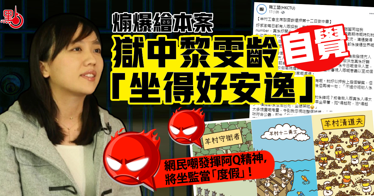 攬炒派工會「香港言語治療師總工會」主席黎雯齡、副主席楊逸意涉發布「羊村系列」三本黑暴童書,被控串媒發布煽動刊物罪,現正被還柙。與其沆瀣一氣的「職工盟」噚日喺fb上載咗黎雯齡嘅獄中信,她形容自己坐監「坐得好安逸」。