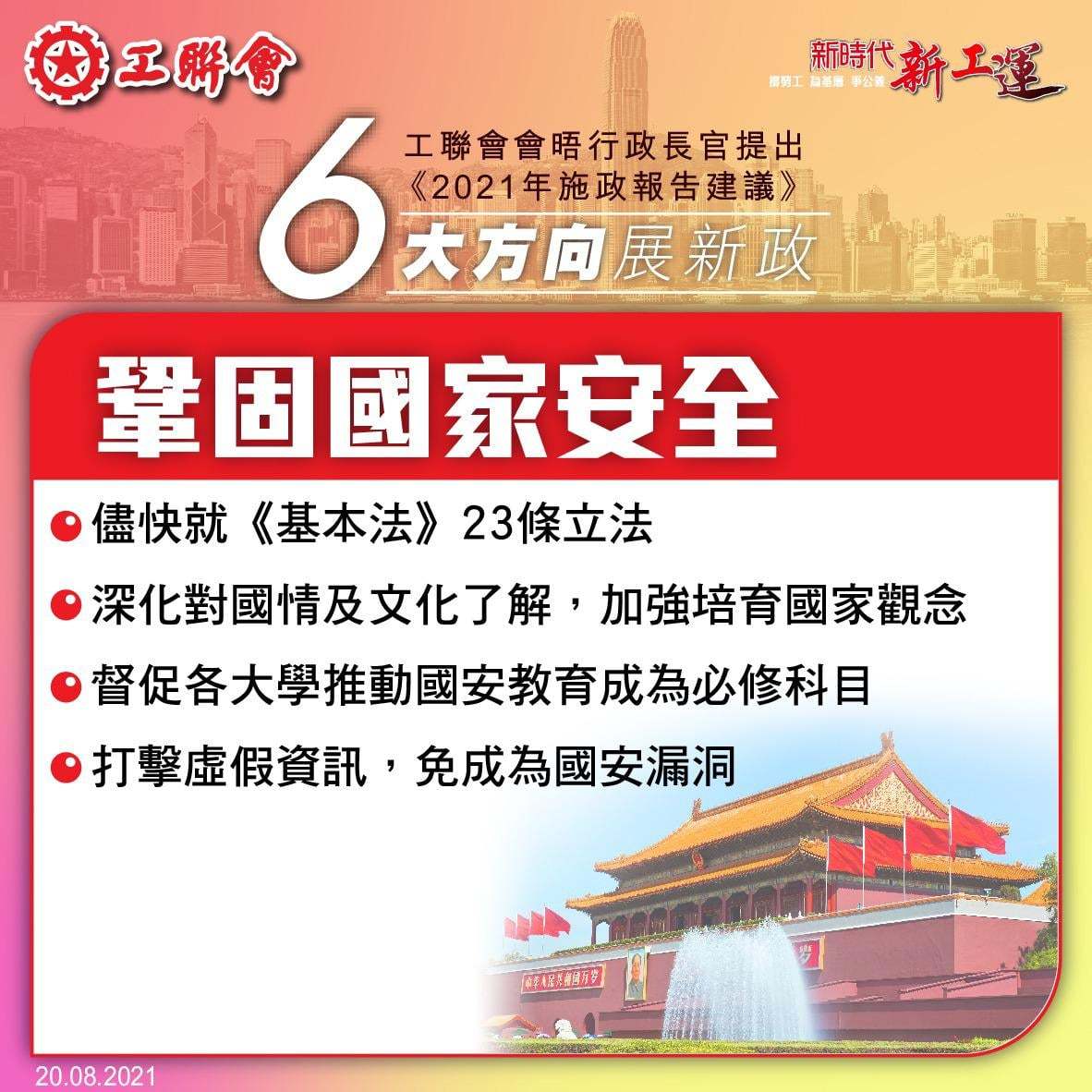 工聯會會長吳秋北指出,2021年的施政報告是香港國安法落實和完善選舉制度通過後的第一份施政報告,工聯會要求政府在六大方向開展新政,包括鞏固國家安全;提升管治能力及施政效率;改善勞工權益;重整經濟結構、培育相關人才;紓貧共富、樂業安居;以及更好融入國家發展大局。