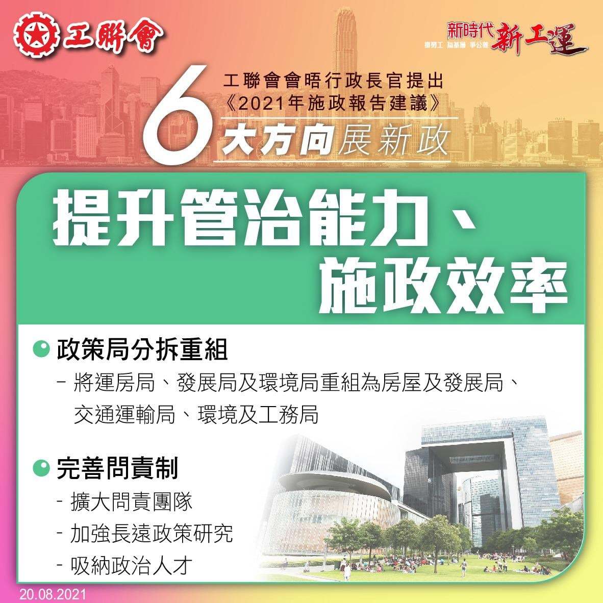 工聯會副會長麥美娟建議部分政策局分拆重組,提升特區政府的管治能力,建議把房屋、發展、運輸及環境政策範疇重組成房屋及發展局、交通運輸局,以及環境及工務局。她又建議完善現時的問責制,包括擴大問責團隊,以及廣泛吸納政治人才,提升政府施政能力。