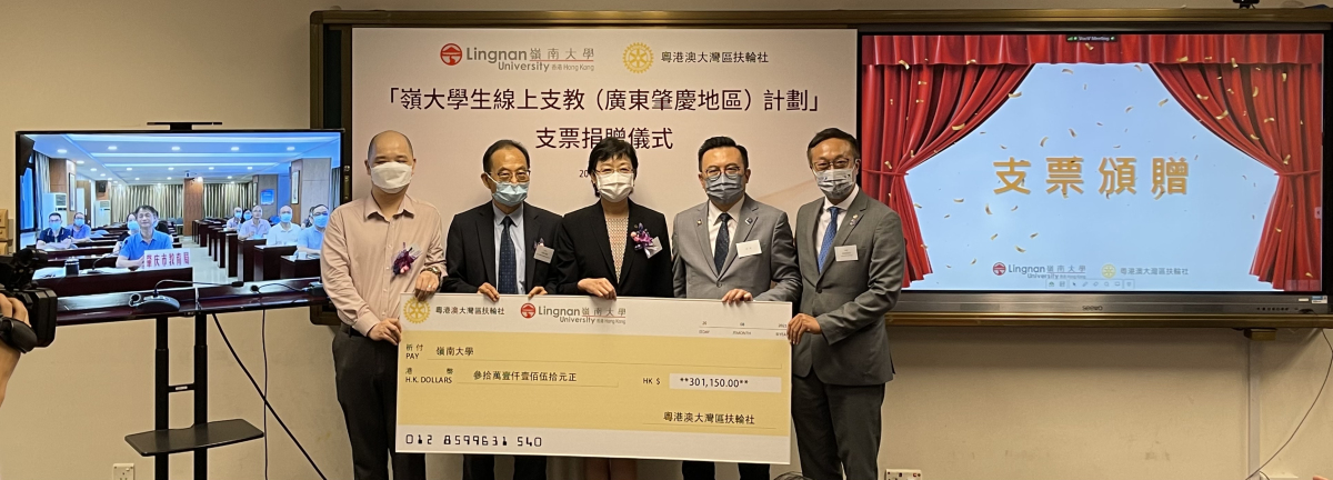 為促進內地偏遠地區教師及學生對STEAM(科學、科技、工程、藝術、數學)及相關知識的掌握和提升,同時促進疫情期間粵港教育的無間斷合作,由粵港澳大灣區扶輪社牽頭、國際扶輪3450地區總監周基業帶領第6區9個扶輪社共14個團體和個人,合共慷慨捐款30多萬港元,支持嶺南大學STEAM教育及研究中心開展「嶺大學生線上支教(廣東肇慶地區)計劃」。有關善款將會為肇慶地區鄉村學校,添置線上支教所需的部分器材設備。支票捐贈儀式今天(20日)在嶺大舉行。
