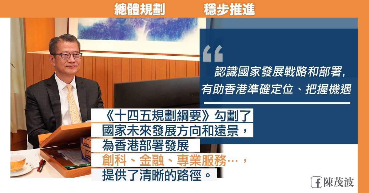 陳茂波指出,《十四五規劃綱要》勾劃了國家未來五年發展方向,對香港未來如何部署創新科技、金融、法律及其他專業服務等發展,提供清晰的路徑。中央安排了宣講團今周到港,通過多場會議向各界介紹《十四五規劃綱要》,特區政府未來亦會繼續加強對外宣傳,向社會多講解規劃綱要對香港發展的重要性。