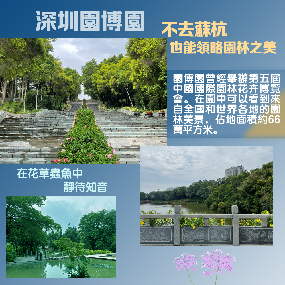 位於深圳市深南大道竹子林西段的深圳國際園林花卉博覽園,也稱園博園。在這裏,不用去到蘇杭,就可以看到美輪美奐的園林設計,園中擁有來自全國和世界各地的園林美景,佔地面積約66萬平方米,秋日徜徉其中,趕走炎暑,體會自然。