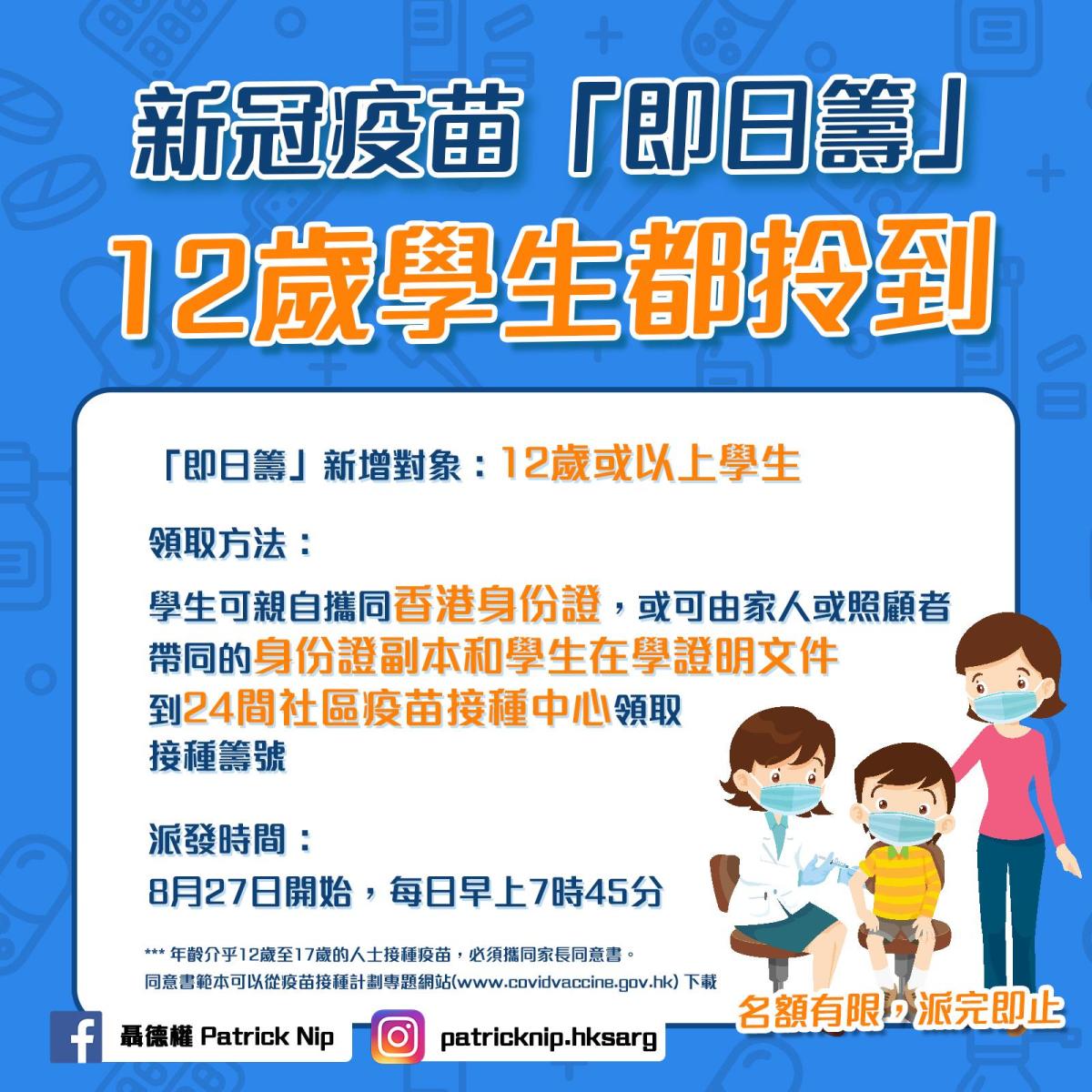 由星期五(27日)起,12歲或以上學生可在24間社區疫苗接種中心(私家醫院除外)領取「即日籌」,可在派籌當天指定時段於中心接種疫苗。