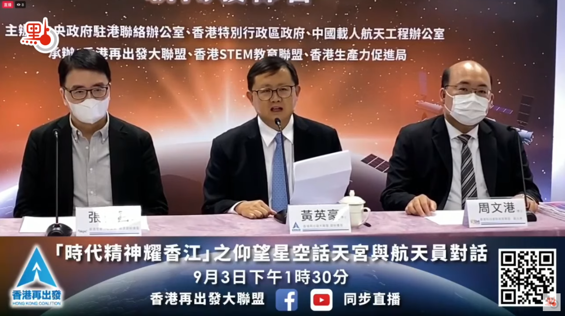 此次「時代精神耀香江」之仰望星空話天宮活動由香港中聯辦、香港特區政府、中國載人航天工程辦公室主辦,香港再出發大聯盟、香港科技創新教育聯盟、香港生產力促進局承辦。香港再出發大聯盟副秘書長黃英豪介紹,活動將於9月3日中午1點10分開始,歷時約1個半小時,活動將在三家承辦單位的facebook、youtube平台進行全程直播,點新聞、橙新聞等平台亦會進行全程網絡直播,香港電台進行電視直播等。黃英豪希望廣大市民能夠通過航天成就認識到國家的進步,感受到作為一名中國人的光榮和自豪,增強對國家及香港發展的信心。