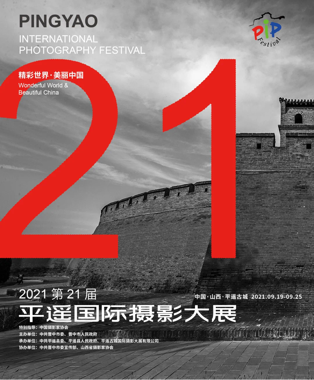 第21屆平遙國際攝影大展主題為「精彩世界·美麗中國」,由3大版塊14個單元構成。分別為攝影作品展、圖片交易、大展評選3大版塊;包括主題展、專題展、學術展、國際展、院校展、類別展、多媒體影像展、PIP中國青年攝影推廣計劃、PIP青少年攝影展、報名展、PIP青年策展人培養計劃、平遙畫廊展會、教室畫廊、評選14個單元。