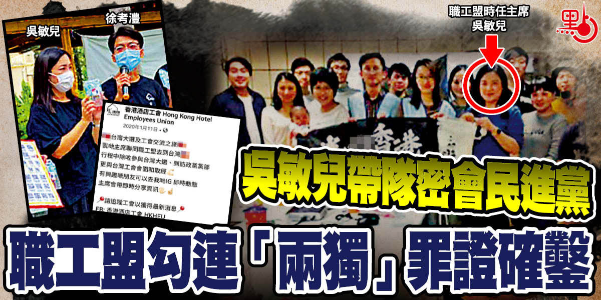 職工盟扶植「黃工會」危害國安!有消息指,執法部門正調查職工盟及其屬會的反中亂港勾當。記者追查發現,去年職工盟時任主席吳敏兒,曾帶隊赴台勾結「台獨」,率香港酒店工會主席、現任職工盟副主席徐考澧等人到民進黨總部勾連,還展示「港獨」旗幟,公然放上網宣「獨」,照片並標註「薪火相傳」字眼,留下「兩獨」勾連罪證。警務處處長蕭澤頤早前專訪,談及職工盟時指出,任何組織可能勾結外國勢力或犯下任何刑事法例如洗黑錢等,都是警方調查範圍。