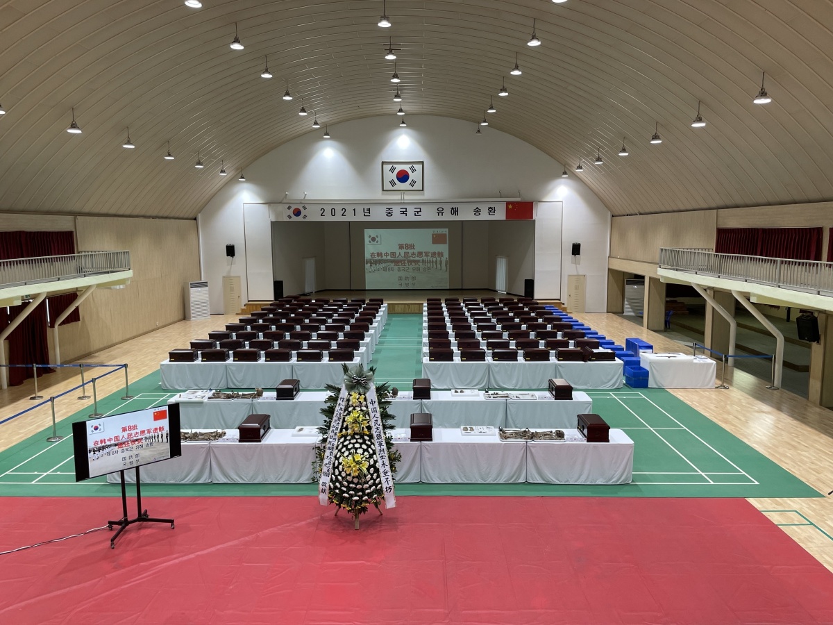 當天上午,中韓雙方代表現場簽署交接書,確認交接109位在韓中國人民志願軍烈士遺骸及相關遺物。中國駐韓國大使邢海明為志願軍烈士棺槨覆蓋國旗,中方舉行悼念儀式,中國人民解放軍禮兵護送烈士棺槨登上解放軍空軍專機,烈士英靈將回到祖國和人民懷抱。