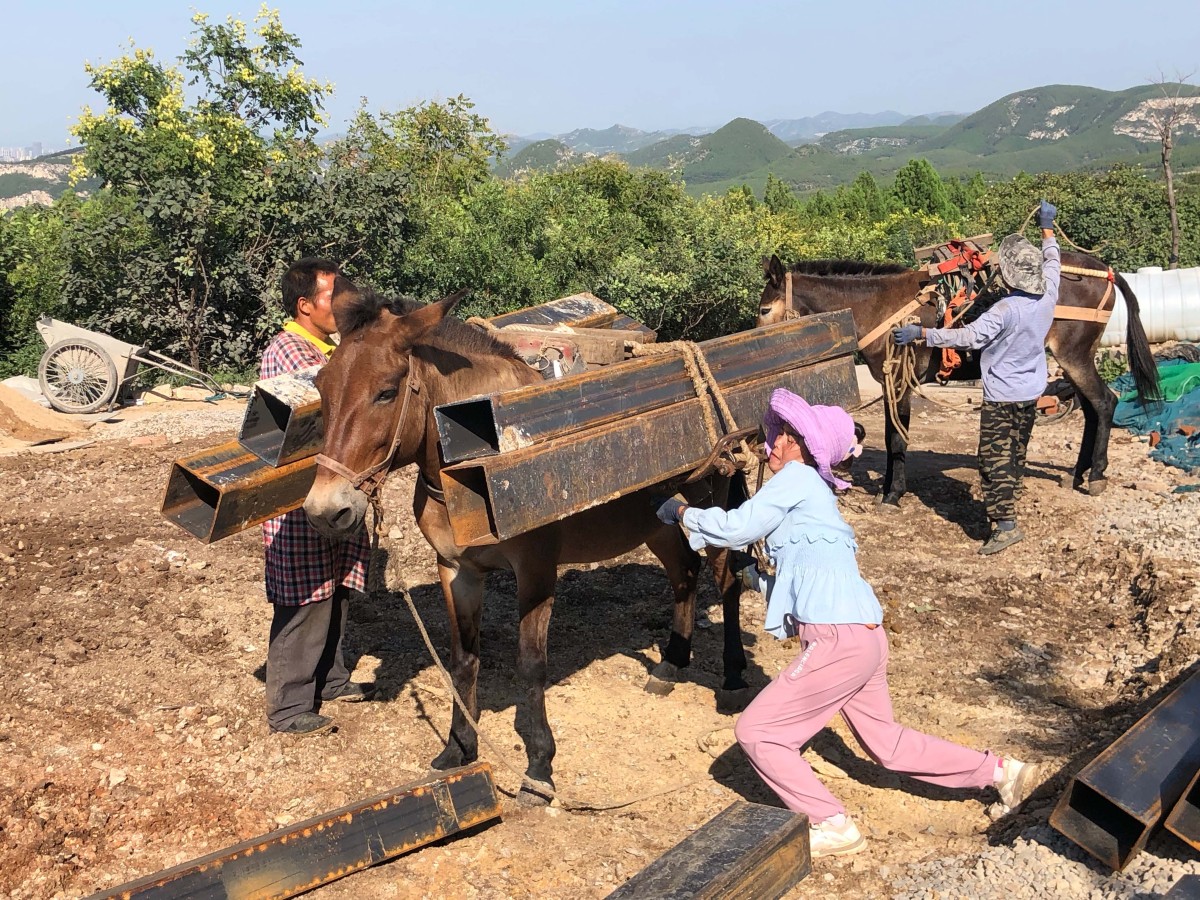 「啊~啊~啊~」隔着一個山頭,點新聞記者就聽到了遠處傳來的吆喝聲。對面山頭接近70度的斜坡處,幾頭馱着鋼條的骡子沿着「之」字型路線艱難攀爬。「押運」的是一男一女,他們大聲吆喝着,不時在後面幫着托一下鋼條。