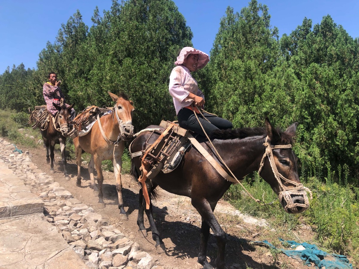從早晨5點開始,庹麥梅和兄弟們趕着19頭騾子,到中午時已在山間往返了4趟,每趟來回大約3公里,需要翻越兩個山頭。騾子運輸的建材主要是沙子、石料以及長長的方鋼,每頭騾子單程負重兩百多公斤,所行之處多為崎嶇險要、現代交通工具無法通行的山道。「要是危險的話就要及時走開,要不然鋼鐵砸下來會砸到人很危險。」庹麥梅一邊「押運」貨物,還要時刻注意險情。