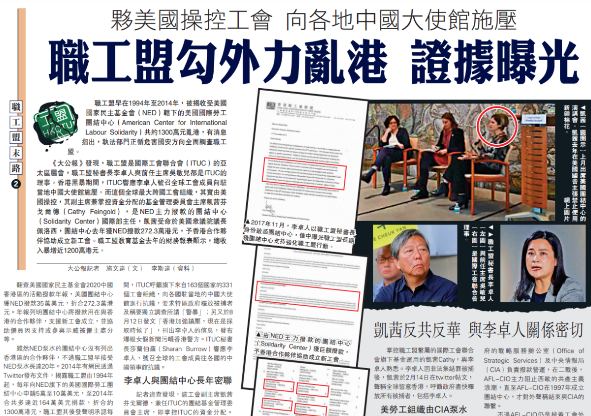 《大公報》發現,職工盟是國際工會聯合會(ITUC)的亞太區屬會,職工盟秘書長李卓人與前任主席吳敏兒都是ITUC的理事。香港黑暴期間,ITUC響應李卓人號召全球工會成員向駐當地中國大使館施壓。而這個全球最大跨國工會組織,其實由美國操控,其副主席兼掌控資金分配的基金管理委員會主席凱茜芬戈爾德(Cathy Feingold),是NED主力撥款的團結中心(Solidarity Center)國際部主任,凱茜受命於美國眾議院議長佩洛西,團結中心去年獲NED撥款272.3萬港元,予香港合作夥伴協助成立新工會。職工盟教育基金去年的財務報表顯示,總收入暴增近1200萬港元。\大公報記者 施文達(文) 李斯達(資料)