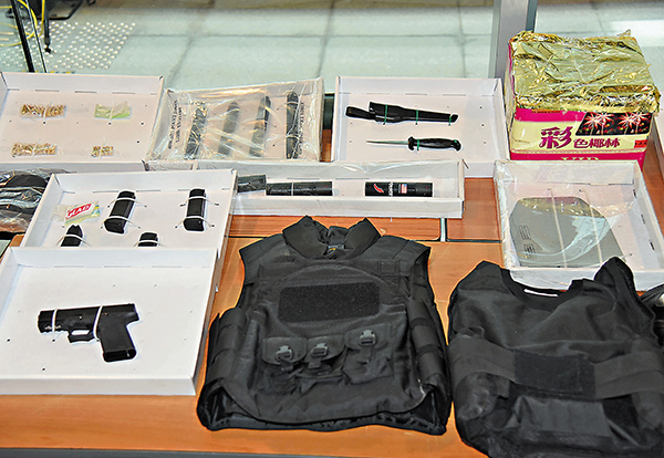 ▶在灣仔克街某單位檢獲裝有防彈陶瓷板的兩件避彈衣;在天后炮台山道單位檢獲半自動手槍、逾100發子彈、3把匕首及1把武士刀