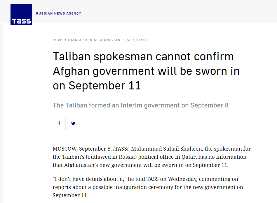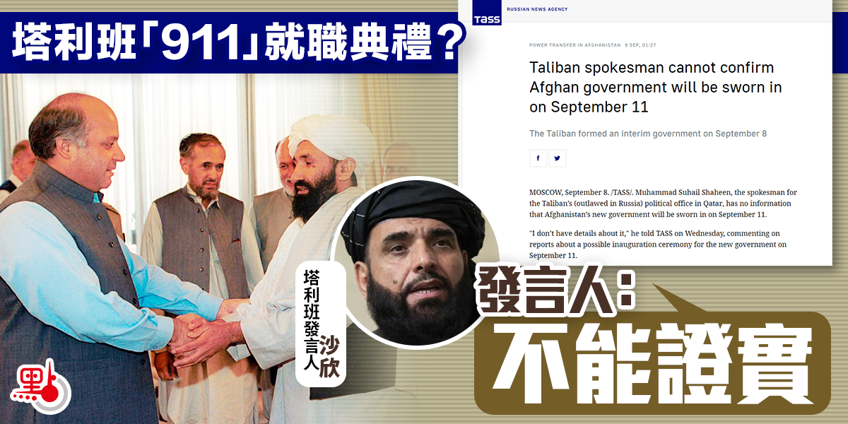 有阿富汗塔利班「消息人士」昨日(8日)告訴俄新社,阿富汗新政府或將在9月11日舉行就職典禮。對此,塔利班發言人蘇海爾·沙欣於當日表示,他並沒有關於此事的信息。