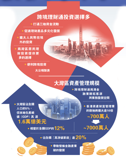 「跨境理財通」最早是在2019年11月提出,香港金管局聯同人民銀行和澳門金管局於去年6月宣布,在大灣區開展跨境理財通業務試點,並在今年2月簽署諒解備忘錄,期望能促進灣區居民跨境投資便利化。目前,大灣區人均GDP超過1.9萬美元,是國家開放程度最高、經濟活力最強的區域之一,而個人財富管理對區內的高收入人士將越來越重要。