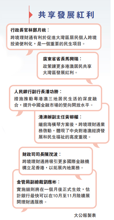 期盼已久的粵港澳大灣區「跨境理財通」業務試點昨日正式啟動,標誌着香港、澳門和廣東省內九市居民可直接跨境投資粵港澳大灣區內銀行銷售的理財產品。香港行政長官林鄭月娥表示,「跨境理財通」是大灣區金融發展的一項里程碑,是首個專為個人投資者而設的互聯互通機制。金管局預計,銀行可在10至11月開始提供業務,初期投資者個人額度為100萬元人民幣。