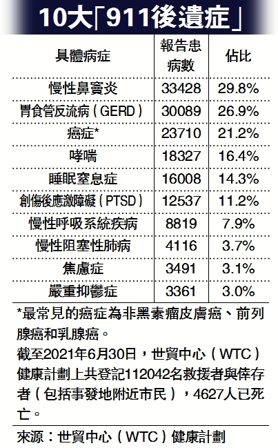 「9·11」恐襲帶來的身心健康問題令數以萬計民眾備受折磨,包括創傷後遺症、肺部和呼吸系統疾病以及癌症等。最新報告指出,受世貿大廈倒塌釋放出的有毒氣體影響,已有近3900人患病離世,超過恐襲當天2996死的數字。