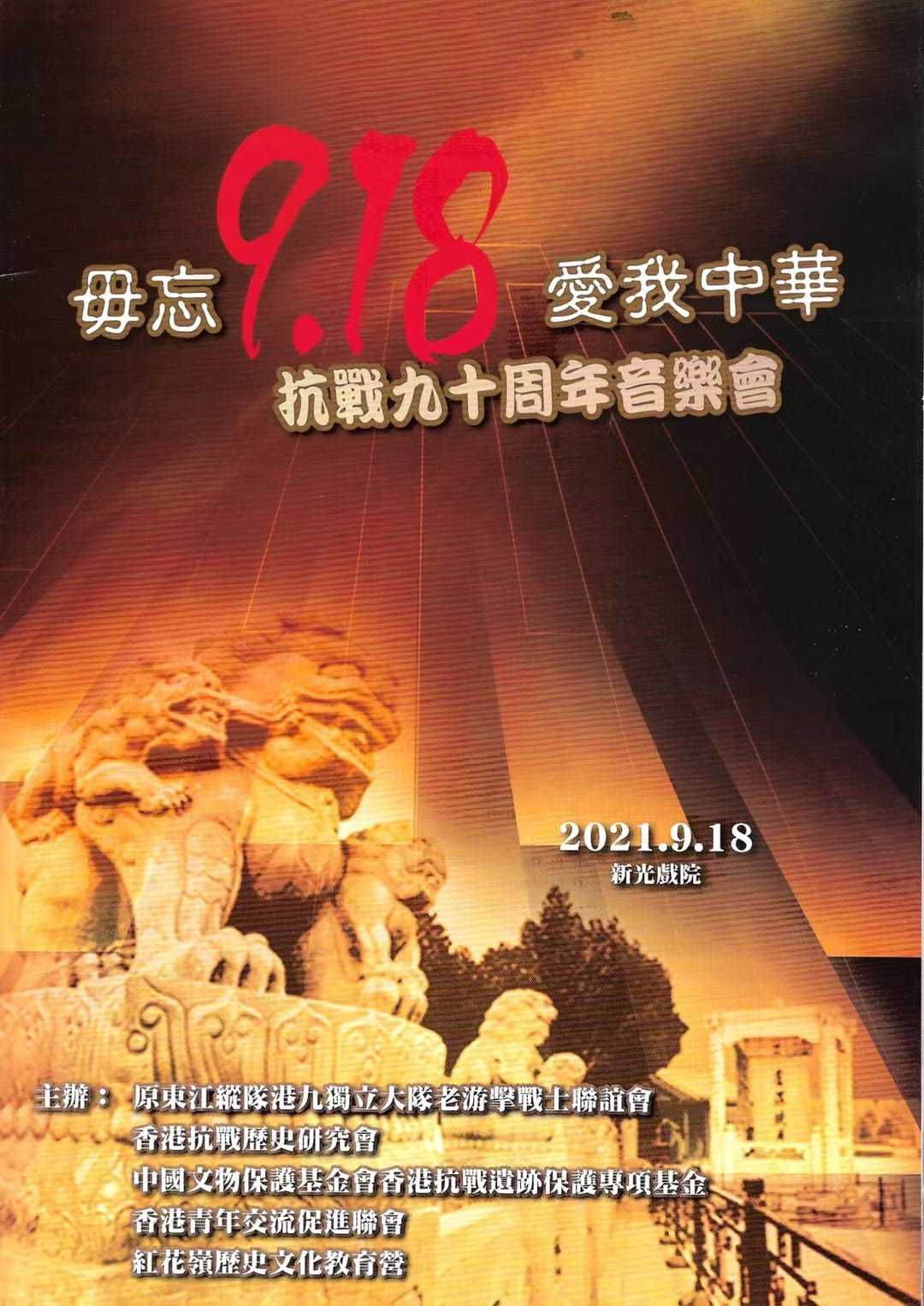 今年適逢「9.18」九十周年,值此之際,原東江縱隊港九獨立大隊老游擊戰士聯誼會、香港抗戰歷史研究會、中國文物保護基金會香港抗戰遺蹟保護基金、香港青年交流促進會、紅花嶺歷史文化教育營等十多個團體,聯同300多位音樂家、歌唱家、表演團隊,今日(18日)共同舉辦「毋忘9.18,愛我中華」紀念抗戰九十周年音樂會,藉抗戰經典音樂,弘揚民族正氣。