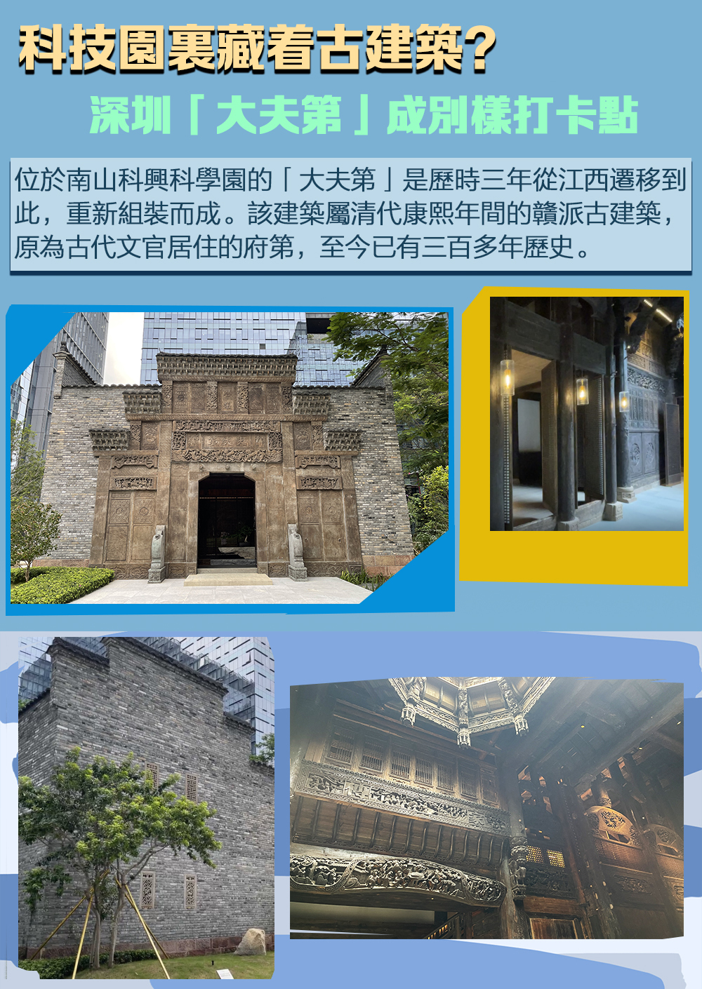 位於南山科興科學園的「大夫第」古建築就是其中之一。資料顯示,該建築屬於清代康熙年間的贛派古建築,原為古代文官居住的府第,至今已有三百多年歷史。建築上馬頭牆、磚雕、青磚黛瓦別緻而古樸。