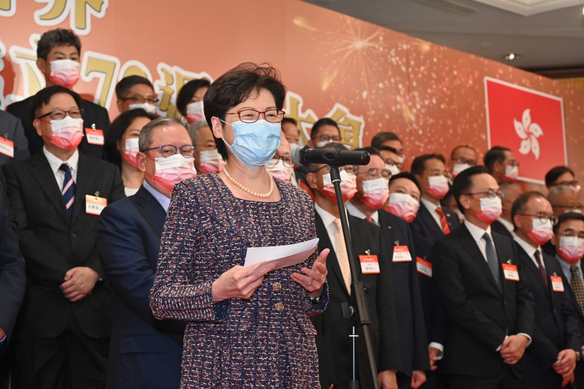 香港潮屬社團總會今日(28日)傍晚舉行「香港潮屬各界慶祝中華人民共和國成立72周年酒會」,行政長官林鄭月娥、駐港國安公署署長鄭雁雄、香港中聯辦副主任何靖、政務司司長李家超、律政司司長鄭若驊等出席。