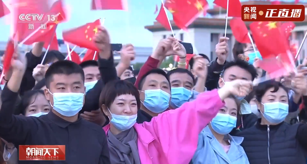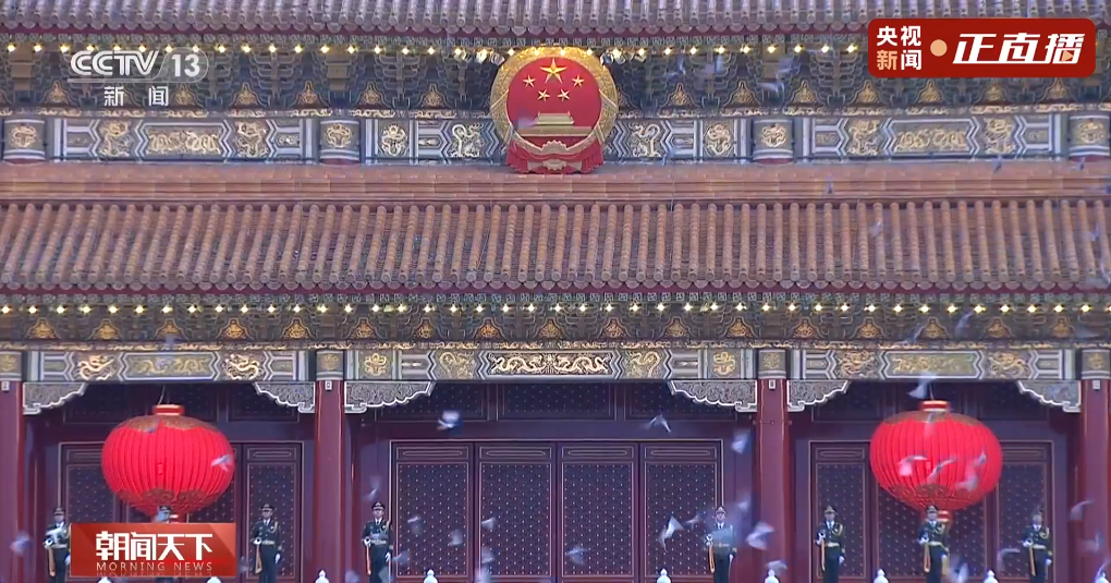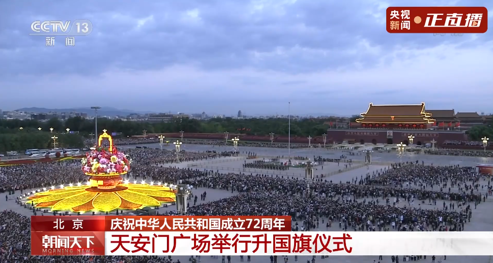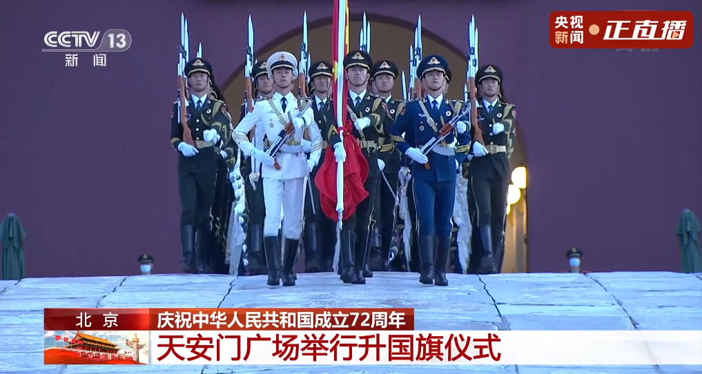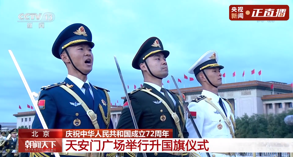 清晨約6時,北京天安門廣場舉行國慶升旗儀式,由海、陸、空三軍儀仗隊負責。有入場觀看的市民向國旗敬禮,現場又放飛象徵和平的白鴿。