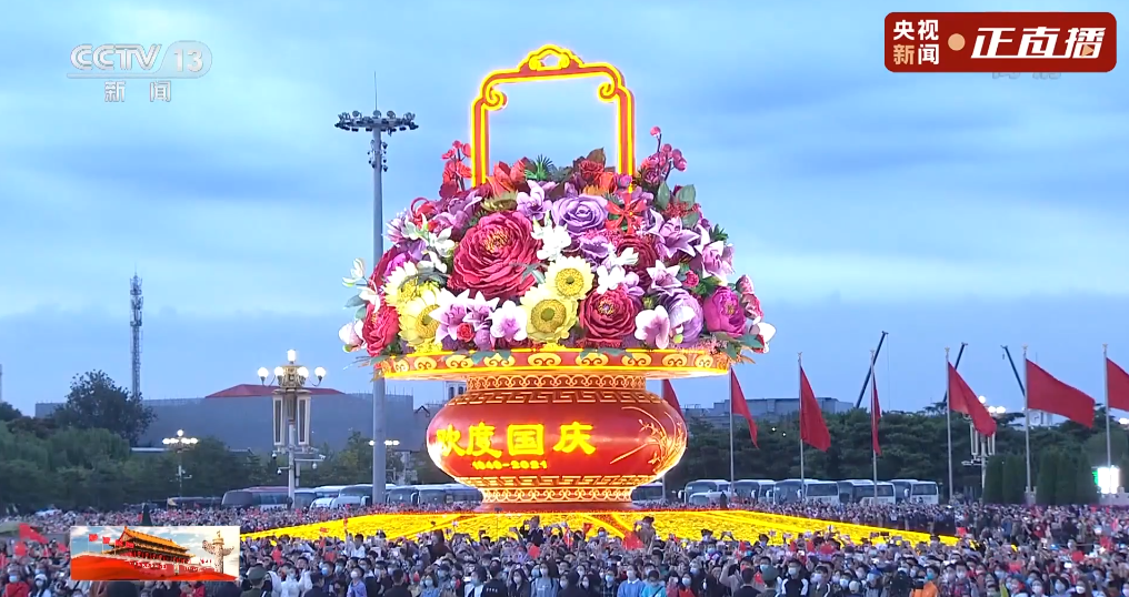 今年是中華人民共和國成立72周年,天安門廣場擺放了高18米、寫上歡度國慶的巨型花壇。因應疫情,入場人士需全程戴上口罩。