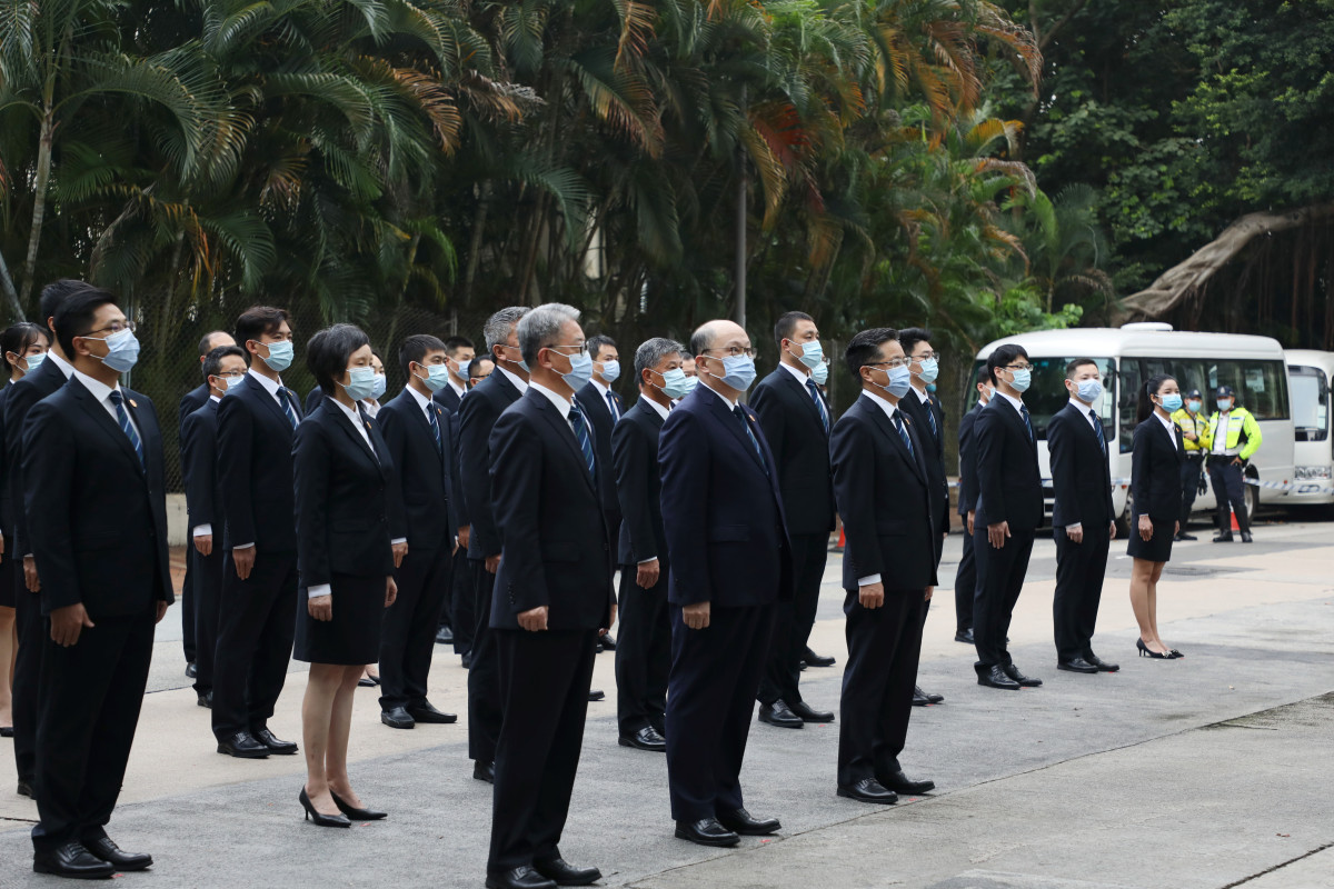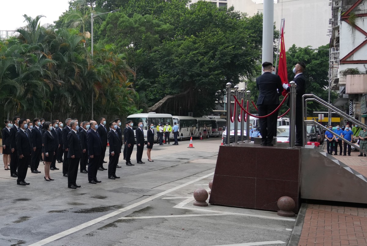 駐港國安公署署長鄭雁雄及多名人員肅立,升旗手將國旗升起,全體人員面向國旗行注目禮,齊聲高唱國歌,祝願祖國繁榮昌盛,香港明天更美好。