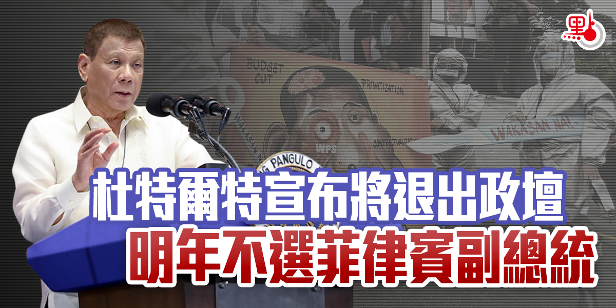 另據海外網消息,當地時間10月2日,菲律賓總統杜特爾特放棄執政黨民主人民力量黨的副總統提名,並表示自己將退出政壇。據菲律賓傳媒報道,杜特爾特當天表示,「我宣布退出政壇,這是順應民眾的願望」。