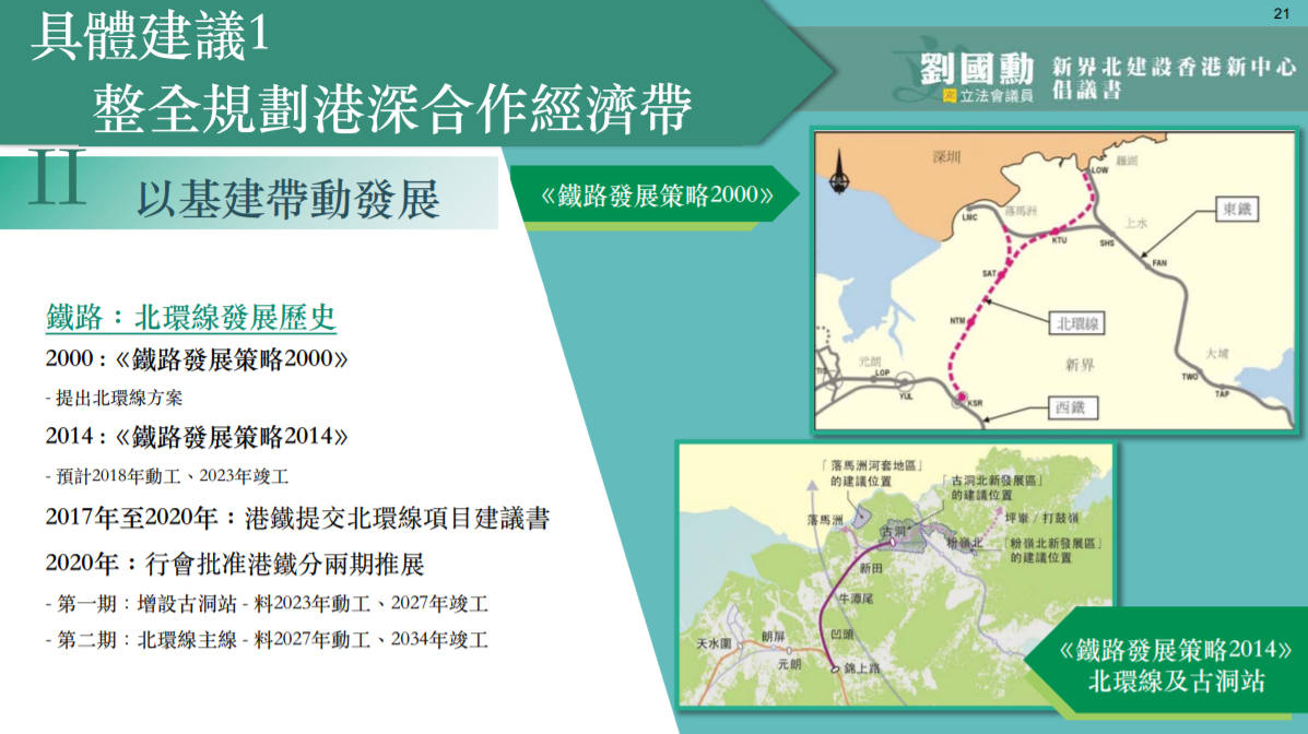 劉國勳指出,新皇崗口岸最快於2023年峻工,接通深圳地鐵7號線、已規劃的20號線、深廣中軸城際線、穗莞深城際線,並採用「一地兩檢」通關模式,將成往來大灣區不同城市的重要交通樞紐,而北環線的規劃嚴重落後於口岸發展,政府有必要加快施工進度。而在南北鐵路方面,劉國勳透露,除連接蓮塘香園圍口岸、打鼓嶺、皇后山及大埔外,政府承諾將在36個月內,公布詳細的走線和設計方案。