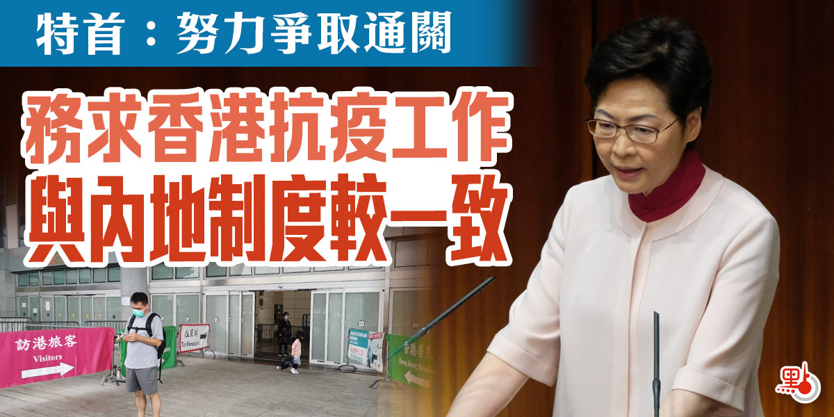 林鄭月娥強調,政府目前立場清晰,會繼續努力、重點與內地通關,因此最近已經舉行一次專家對接會議,討論本港哪方面的抗疫工作要加強或調較,務求與內地機制比較一致,令中央聯防聯控高層會議接受。