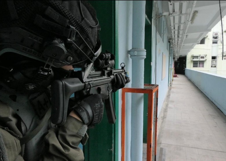 在演習中,警方模擬恐怖分子持槍進入長沙灣一間學校,襲擊市民造成多人傷亡,大批荷槍實彈警員包括反恐特勤隊接報後到達現場,成功制服及拘捕兩名恐怖分子,救出人質。