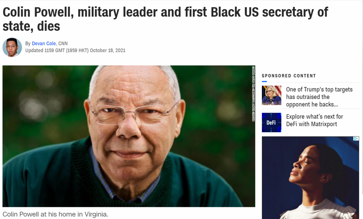 據悉鮑威爾是第65任美國國務卿,也是美國歷史上首位任職美國國務卿的非裔美國人。他在1990至1991年的海灣戰爭中擔任參謀長聯席會議主席,是第一位擔任此一美軍最高軍職的非裔美國人。