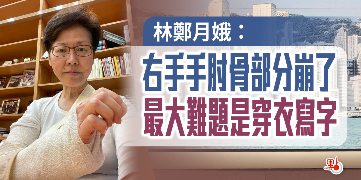 林鄭月娥今日下午5時45分在社交平台發文,並上載照片顯示其受傷的右手。林鄭月娥表示,昨晚在禮賓府宴請退休同事,晚宴開始前下樓時從梯級跌了下來,初時以為是皮外傷,但右手愈來愈痛,於是送客後便自行到瑪麗醫院求診。經檢查和照X光後,發現是右手手肘骨有部分「崩」了,於是馬上打石膏固定,讓它自然癒合,相信要兩、三個星期。她說:「住院一晚並接受腦部掃描及其他部位檢查後,今早已出院回禮賓府休息。我感謝瑪麗醫院醫療團隊的悉心照顧,並對各位同事和朋友送上的關懷,感到窩心。不過,現在最大的難題恐怕是穿衣和寫字啊!」