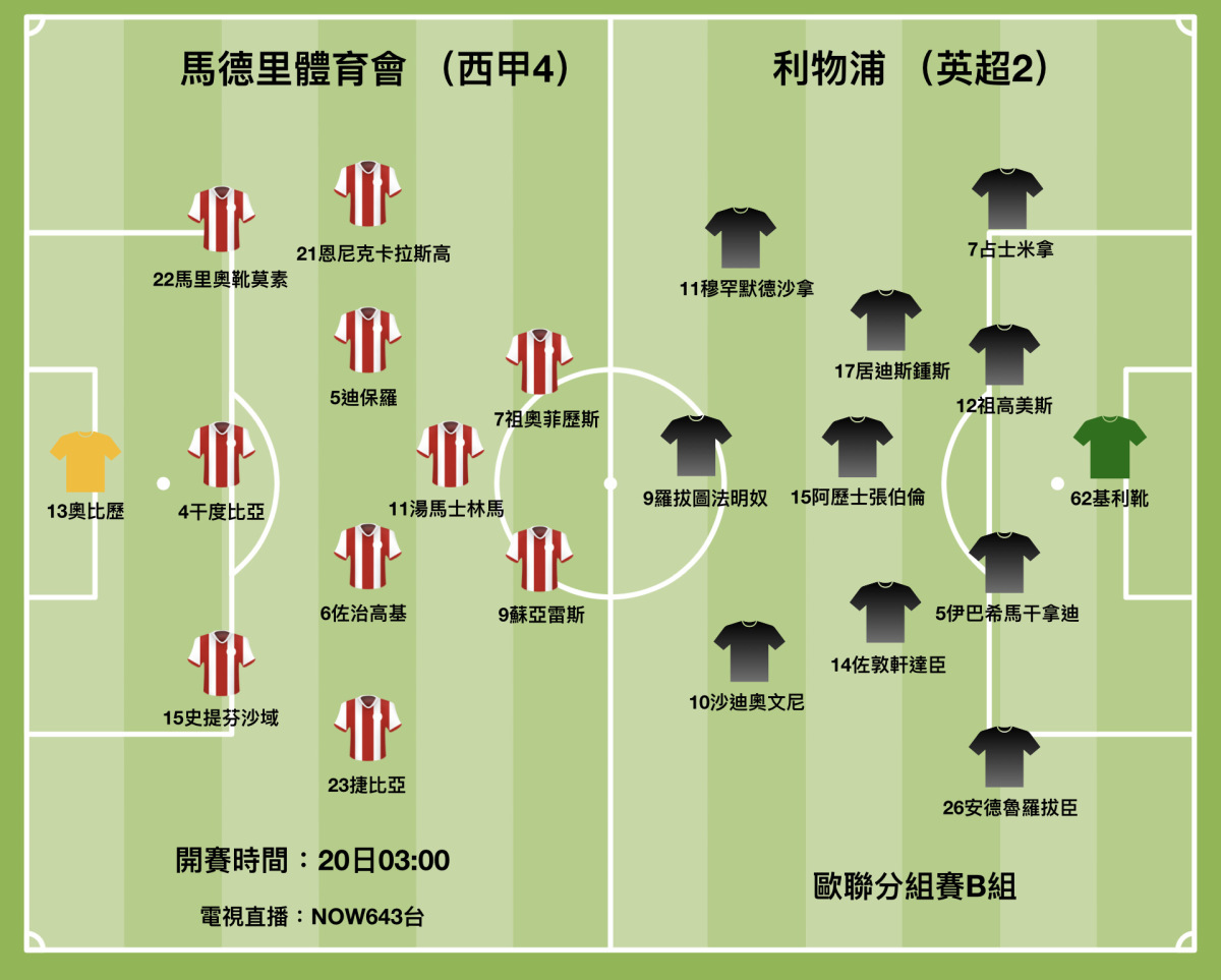 「紅軍」利物浦在歐聯B組分組賽第3輪遇到同組第二位的馬德里體育會。球隊攻力雖然強勁,但基於早前消耗甚大,加上有英超作客大戰曼聯後顧,主帥高洛普或會機關算盡,收起部份主力之餘,也不介意球隊只取一分返航。(香港時間周三凌晨3時開賽,NOW643台直播)