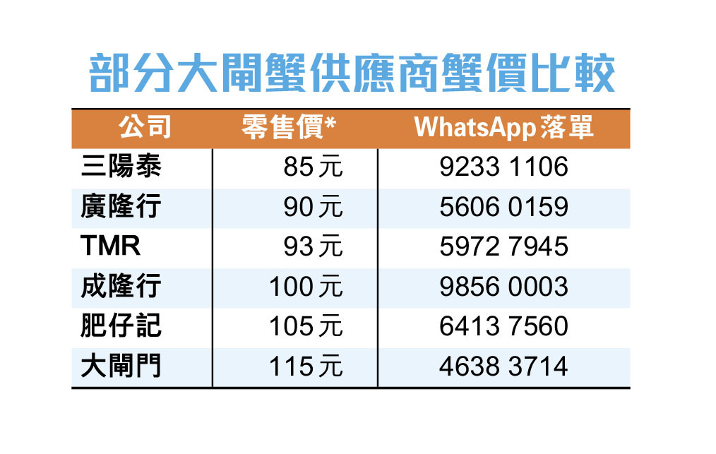 翁先生補充說,該店今年蟹價與去年差不多,以他銷售的5両重清水大閘蟹公蟹為例,售價為85元,絕對不會將貨就價。他又稱,該店主力做批發,如批發給酒樓、餐廳、酒店放題等,零售只佔很少部分,但今年確實有不少市民在公司的WhatsApp落單。