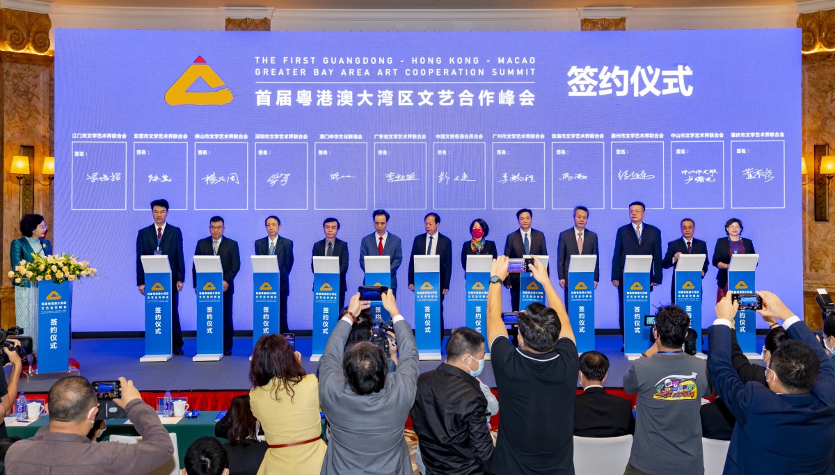 廣東省文聯、中國文聯香港會員總會(香港文聯)、澳門中華文化聯誼會和廣州、深圳、珠海、佛山、惠州、東莞、中山、江門、肇慶9市文聯共12家單位代表,於今日(27日)共同簽署了《粵港澳大灣區文藝合作峰會成員單位合作備忘錄》,將通過峰會這一合作機制推動大灣區文藝組織、團體、機構開展交流合作,大力推動文藝創新,打造優質文藝展示平台,提升大灣區文藝影響力。