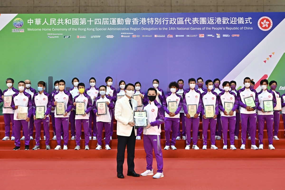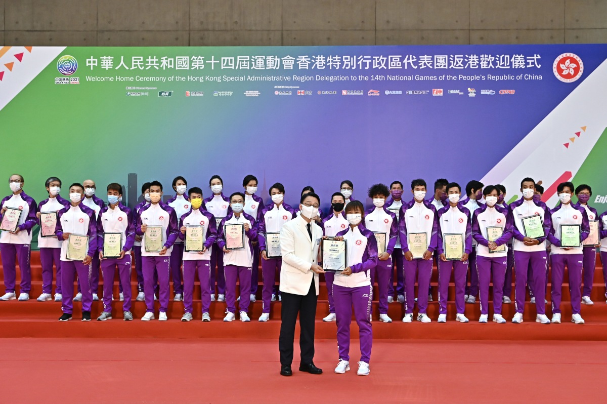 港隊在今年陝西省舉行的第十四屆全運會上取得2金5銅的佳績。特區政府今日(28日)舉行第十四屆全運會香港特區代表團返港歡迎儀式,向運動員頒發嘉許狀。