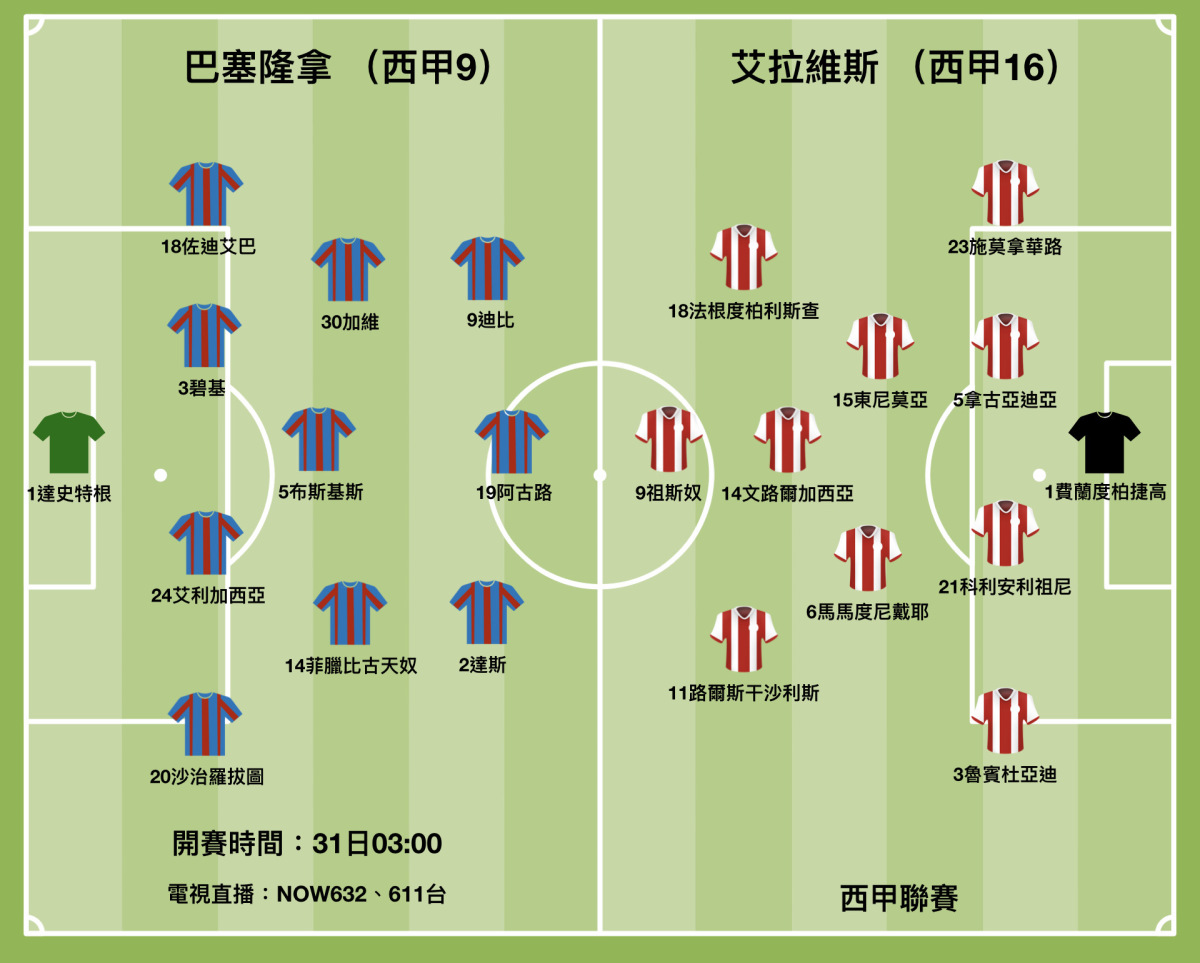 作客的艾拉維斯雖然錄得兩連勝,但贏艾爾切、卡迪斯均屬中下游隊伍,他們作客魯營球場面對急於回勇的巴塞,的確有生不逢時的味道。該隊中場球員馬馬度尼戴耶是上仗奠勝的功臣,連同近10場聯賽攻入3球的前鋒祖斯奴,料未能對巴塞後防構成嚴重威脅。