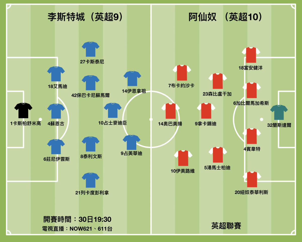 「兵工廠」阿仙奴捱過季初成績不振後,最近8仗錄得6勝2和僅失4球佳績,一眾新兵如富安健洋、賓韋特、蘭斯達爾均展示與身價相符的表現,看來李斯特城的中興走勢,會來到短暫的終結。(香港時間周六晚上7時30分開賽,NOW621、611台直播)