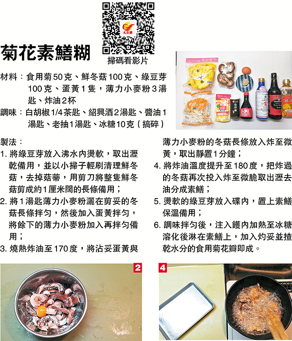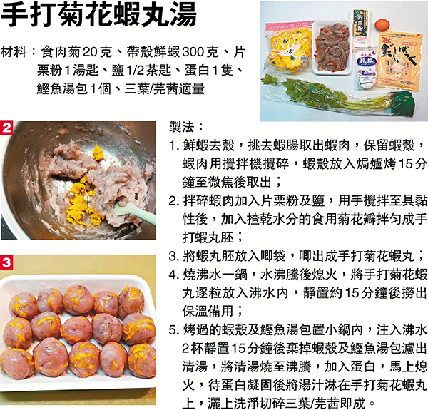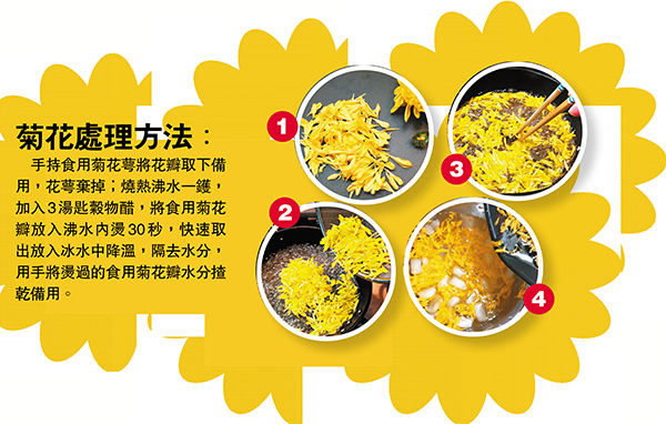 菊花,自古以來是常用的養生食材,能疏風清熱、平肝明目,食用菊就是指被栽培作食用的菊花。菊花中含有豐富的碳水化合物、膳食纖維、蛋白質、脂肪和微量元素等營養物質,還含有黃酮、菊甙、膽鹼和菊色素等有益成分,不僅能為人體提供營養,還有清熱去火、殺菌消炎、護眼明目、提神醒腦和抗衰老等養生功效。現在,秋天正是新鮮食用菊當造季節,黃花秋意晚,菊秀正好入饌,今期就以食用菊為大家烹調三道養生菜。