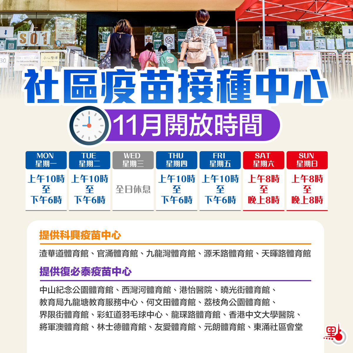 政府今日(31日)提醒市民留意社區疫苗接種中心的最新開放時間。由明日(11月1日)起,社區疫苗接種中心的開放時間為逢星期一、星期二、星期四和星期五上午10時至下午6時,而星期三全日休息。逢星期六及星期日的開放時間為上午8時至晚上8時。所有疫苗接種中心運作日的下午1時半至2時半為清潔時間。