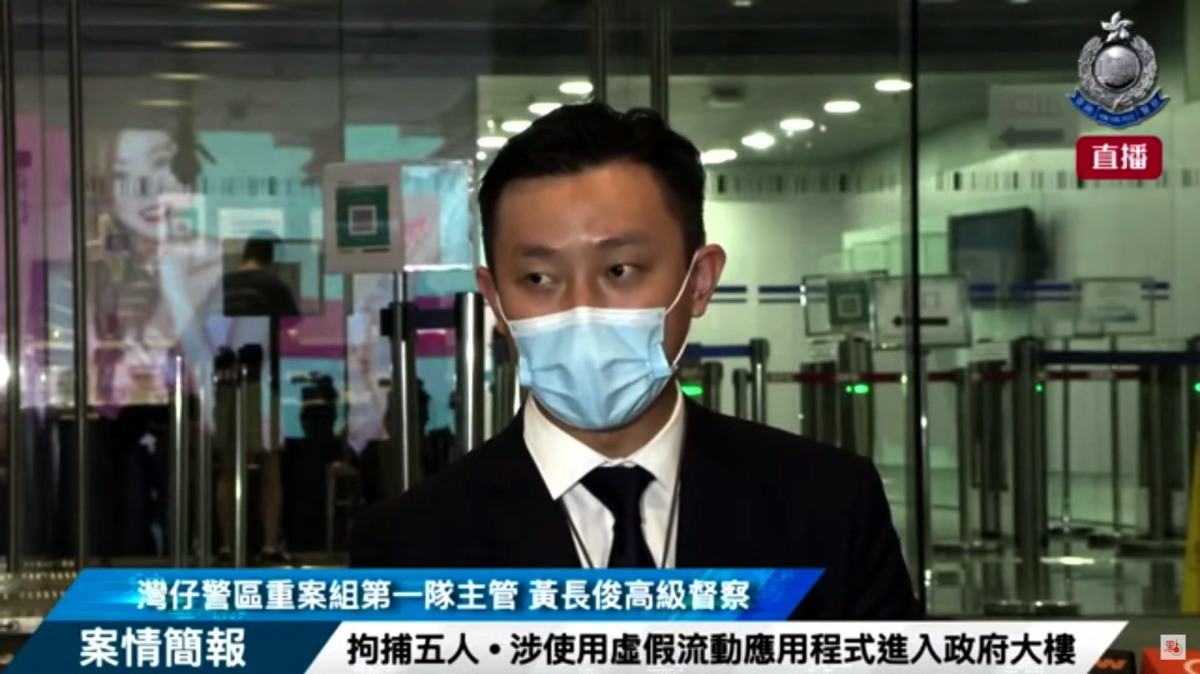 警方表示,昨日上午接獲入境處報案,指有人涉嫌使用假冒「安心出行」,意圖進入灣仔入境事務大樓。警員接報到場,經初步調查將5人拘捕,案件交由灣仔警區重案組第一隊調查。根據調查,其中4人是用同一款懷疑假冒「安心出行」的程式。被捕人同在一個軟件開發網頁平台登入假冒程式,並安裝手機應用程式圖標,模仿已經安裝「安心出行」。假冒程式界面上,用戶可以自行輸入地址資料,從而偽造到訪處所紀錄,相信該假冒程式就是坊間俗稱的「安心回家」。而其餘一名男被捕人,則是在進入大樓時刻意避過檢查。根據調查,該名被捕人當時出示的是過往到訪入境事務大樓的「安心出行」手機截圖。