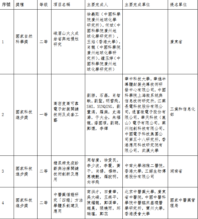 除香港科研團隊主導完成的項目外,四個香港學者參與的項目亦在本年度獲獎,展現出兩地科技交流不斷加深的趨勢。香港大學王焰參與、由中國科學院廣州地球化學研究所徐義剛研究員主導的《峨眉山大火成岩省與地幔柱研究》獲得國家自然科學獎二等獎。獲得國家科學技術進步獎一等獎的《高密度高可靠電子封裝關鍵技術及成套工藝》項目,由工業和信息化部提名,華中科技大學、香港應用科技研究院有限公司等共同完成。