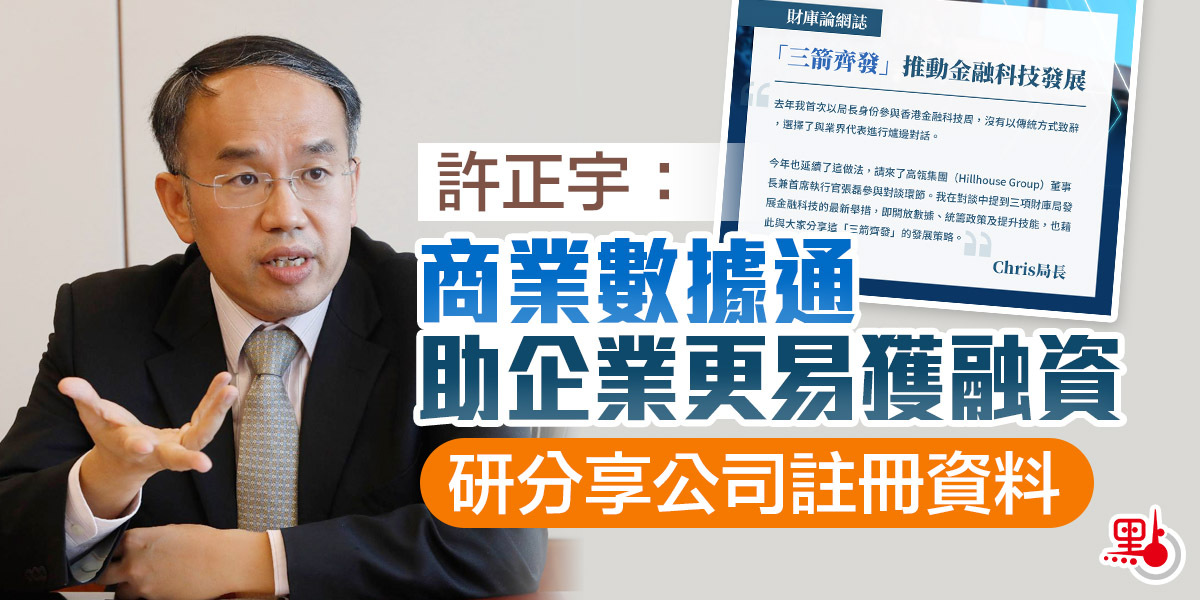 財經事務及庫務局局長許正宇今日(3日)在網誌中表示,將以「三箭齊發」策略,即開放數據、統籌政策及提升技能,推動金融科技發展。他提及「商業數據通」,指在充分保護私隱及企業授權的情況下,開放政府數據讓金融機構使用,將可有效降低信貸審批過程中的不確定性和成本,讓企業更容易獲得融資。