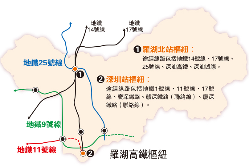 ●羅湖北站樞紐:途經線路包括地鐵14號線、17號線、25號線、深汕高鐵、深汕城際。