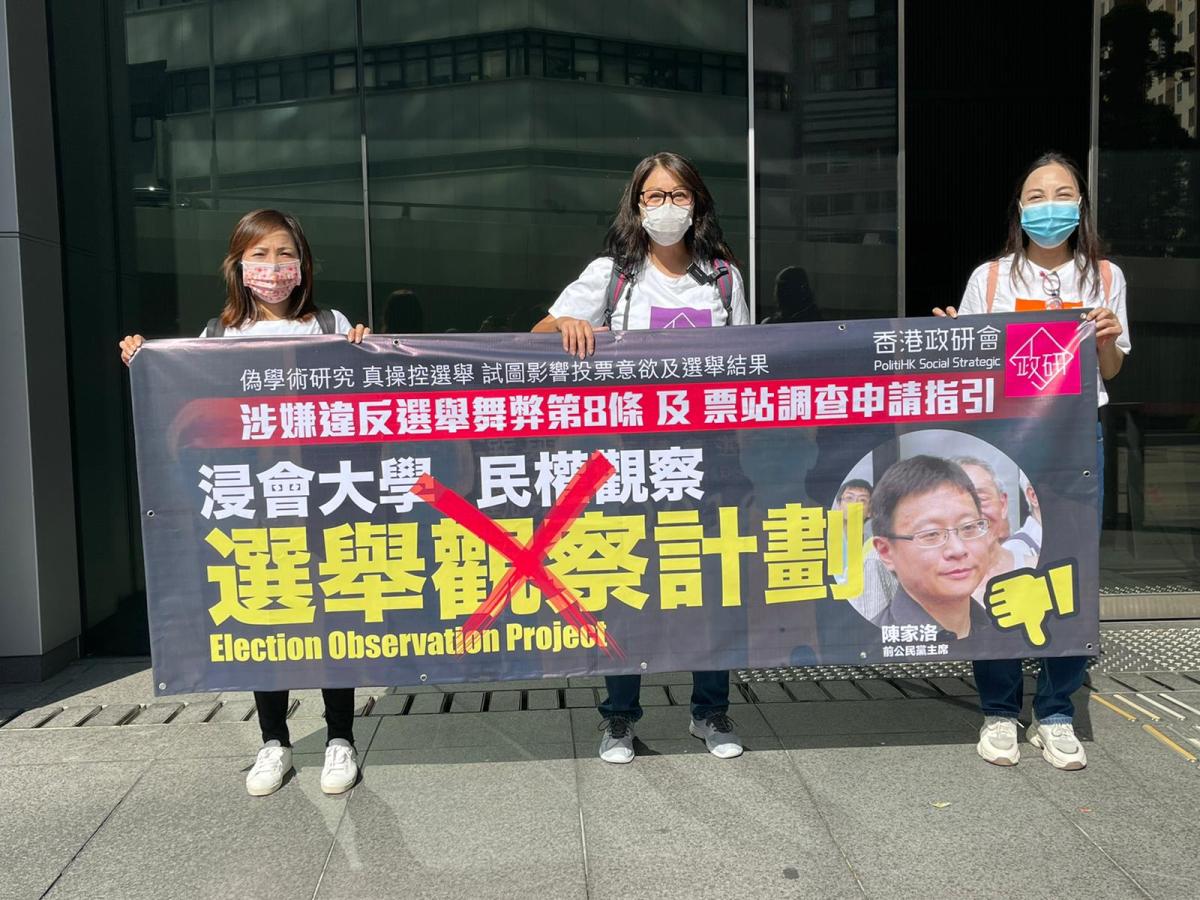 團體「香港政研會」昨日派出代表向廉政公署作出正式舉報。發言人表示,陳家洛以浸會大學政治及國際關係學系比較管治及政策研究中心副教授名義,聯同民權觀察於9月19日,亦即「選舉委員會界別分組選舉日」,曾派出20人到5個投票站,涉嫌違法收集選民資料。