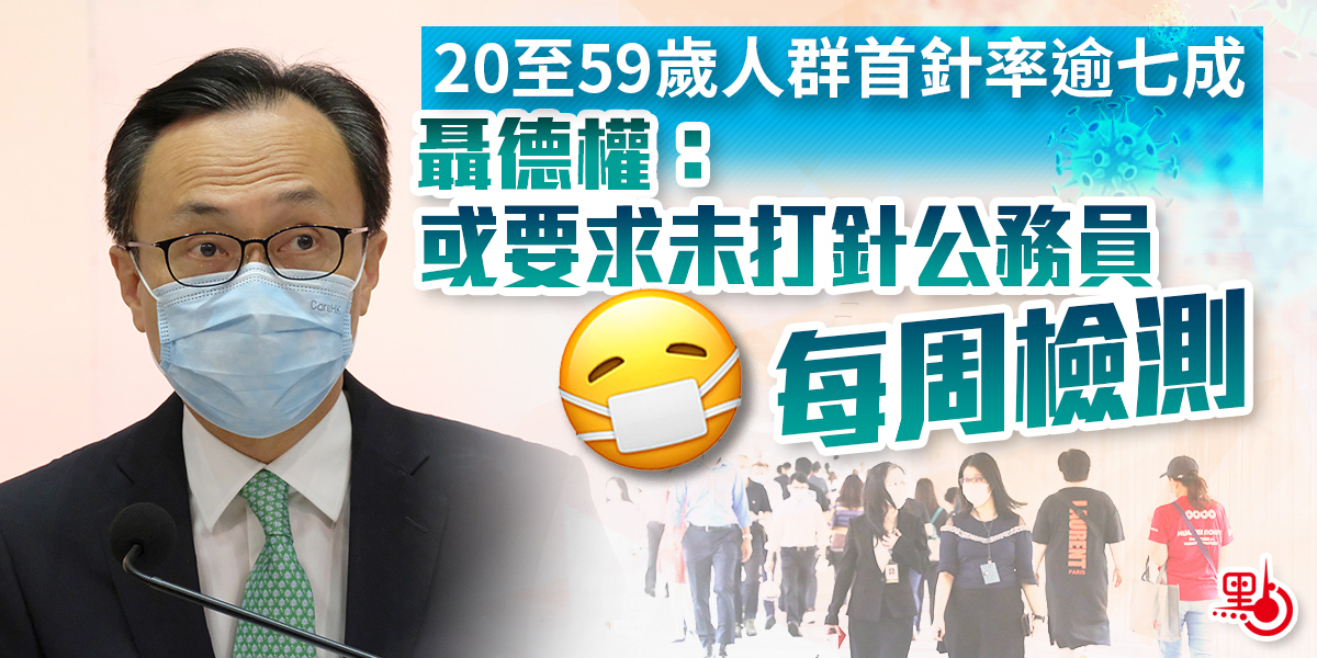 公務員事務局局長聶德權今日(7日)在一個電台節目表示,目前20至59歲工作人口的新冠疫苗首劑接種率已超過七成,如果要進一步推高接種率,政府或會要求未打針公務員的自費檢測頻率由兩周一次加密至一周一次,以鼓勵接種新冠疫苗。他亦希望到時私人企業也可以跟循。