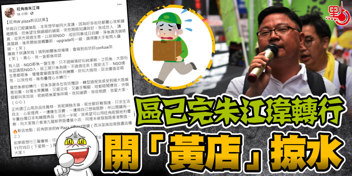 變咗區已完嘅油尖旺前區議員朱江瑋,噚日在社交平台話,已疊埋心水轉行,喺旺角商場租個舖位從事零售生意,將於下周一開始試業,12月先正式開張喎。曾受僱於非政府組織嘅朱江瑋話,自己成世人從來冇做過生意,早前嘗試經營台灣水果團購,結果搞到又遲交收,又雞手鴨腳咁話。佢自嘲「我呢類蝕本貨,呢世都好難發達,只求生活自主,心安理得」,計劃間舖會有一半賣台灣、日本同韓國食品,另一半就推介未被發掘嘅香港製造。