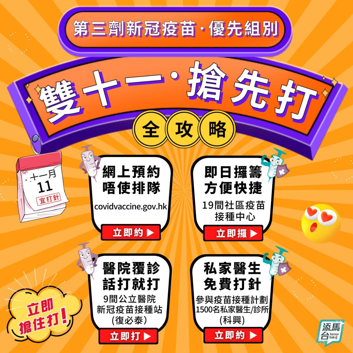 今日(11月11日)「雙十一」除了是網購的好時機,也是本港第三劑新冠疫苗開打的日子,優先組別人士、即免疫力弱的病人和有較高感染風險的人士,可以率先由今日起打第三針。